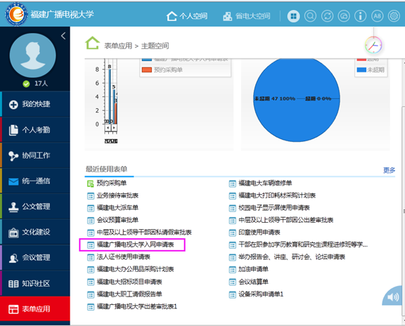 2.点击页面右侧底部“最近使用表单中”的【福建广播电视大学入网申请表】,如下图