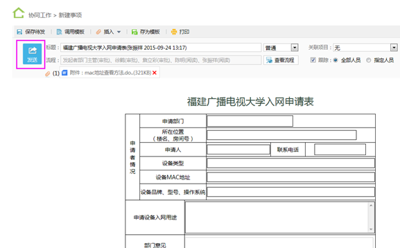 3.按要求填写入网设备的相关信息,然后点击【发送】按钮,如下图