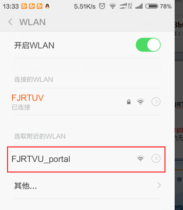 1.打开手机WIFI,选择连接名称为“FJRTVU_portal”的无线WIFI,如下图