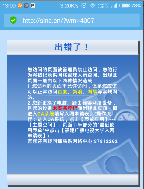 3.输入无线上网的账号和密码,点击【登录】按钮即可正常上网,若出现如下图提示,请按“设备入接入校园网OA系统申请流程”提交入网申请,申请通过后即可正常上网。